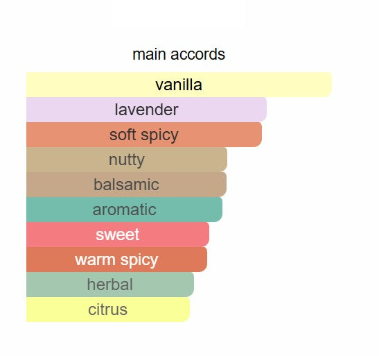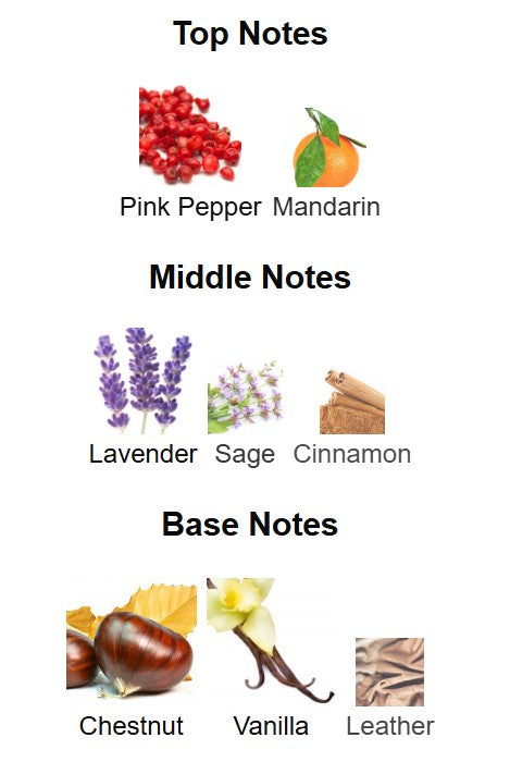 Top notes are Pink Pepper and Mandarin; middle notes are Lavender, Sage and Cinnamon; base notes are Chestnut, Vanilla and Leather.
