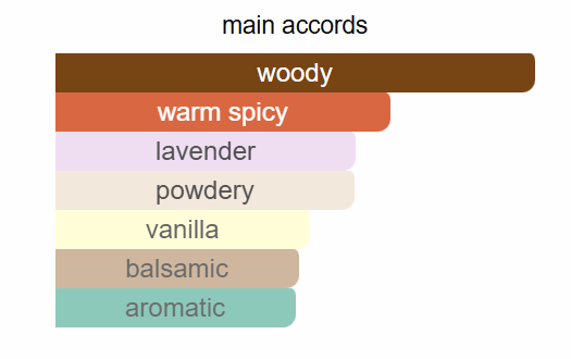 Top note is Saffron; middle notes are Lavender and Chestnut; base notes are Sandalwood, Cedarwood and Vanilla.