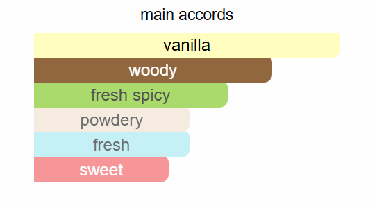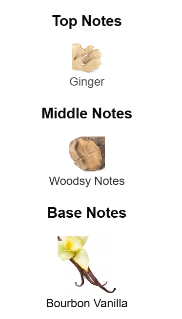 Top note is Ginger; middle note is Woodsy Notes; base note is Bourbon Vanilla.