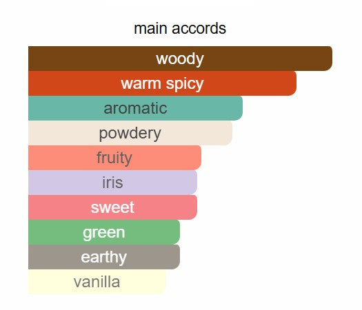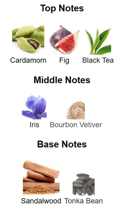 Top notes are Cardamom, Fig and Black Tea; middle notes are Iris and Bourbon Vetiver; base notes are Sandalwood and Tonka Bean.