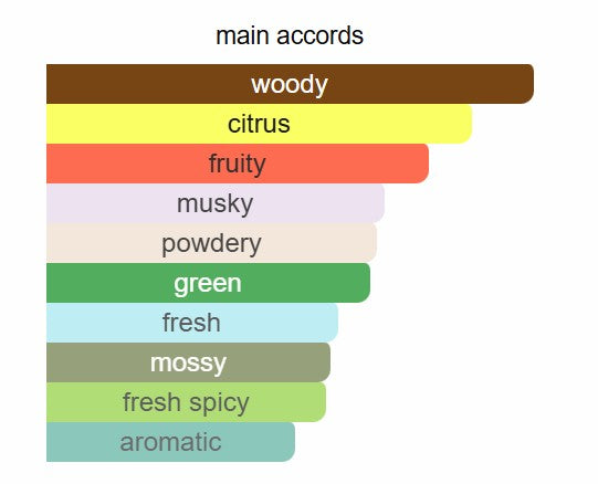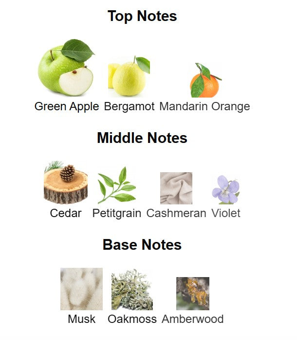 Top notes are Green Apple, Bergamot and Mandarin Orange; middle notes are Cedar, Petitgrain, Cashmeran and Violet; base notes are Musk, Oakmoss and Amberwood.