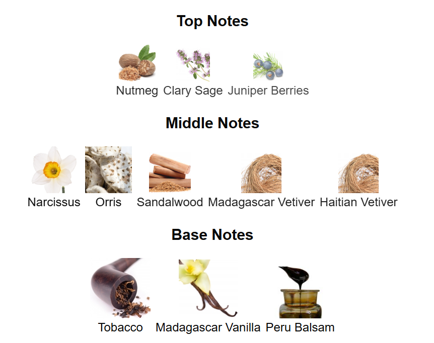 Top notes are Nutmeg, Clary Sage and Juniper Berries; middle notes are Orris, Narcissus, Sandalwood, Madagascar Vetiver and Haitian Vetiver; base notes are Tobacco, Madagascar Vanilla and Peru Balsam.
