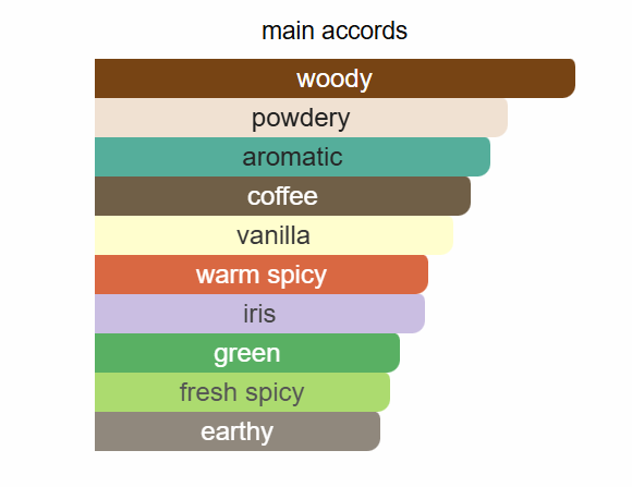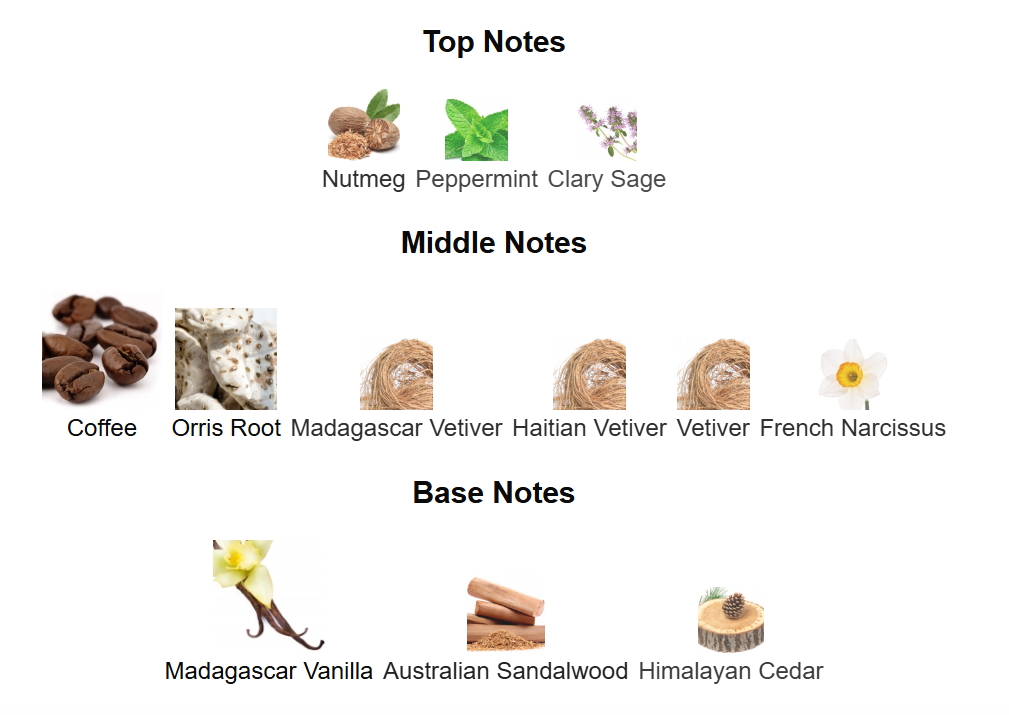 Top notes are Nutmeg, Peppermint and Clary Sage; middle notes are Coffee, Orris Root, Madagascar Vetiver, Haitian Vetiver, Vetiver and French Narcissus; base notes are Madagascar Vanilla, Australian Sandalwood and Himalayan Cedar.