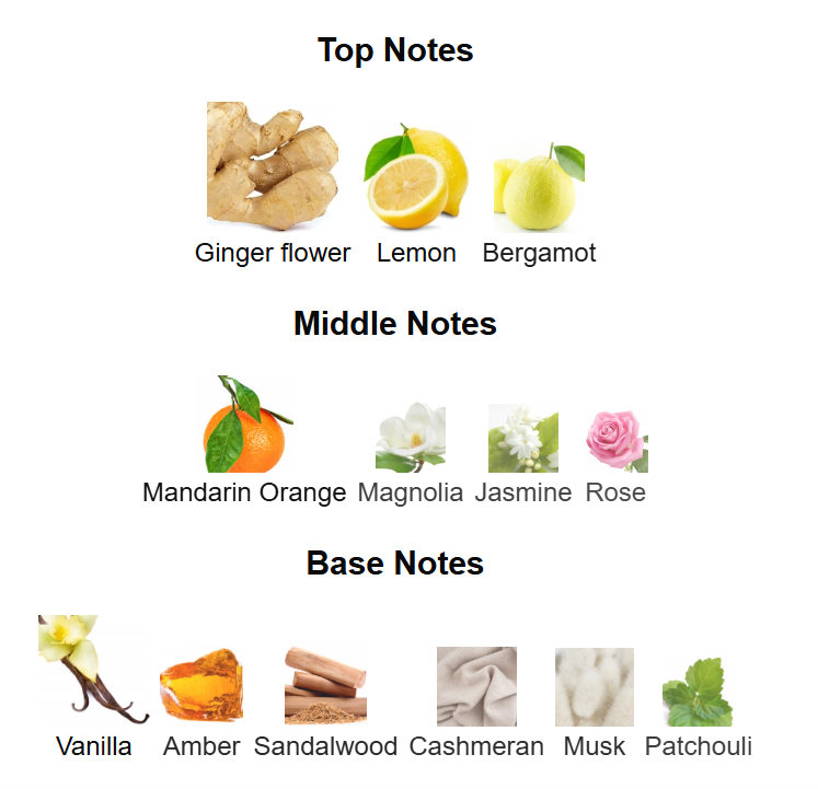 The nose behind this fragrance is Hamid Merati-Kashani. Top notes are Ginger flower, Lemon and Bergamot; middle notes are Mandarin Orange, Magnolia, Jasmine and Rose; base notes are Vanilla, Amber, Sandalwood, Cashmeran, Musk and Patchouli.