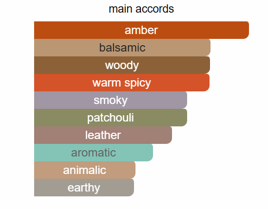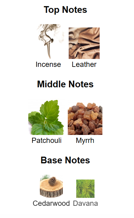 Top notes are Incense and Leather; middle notes are Patchouli and Myrrh; base notes are Cedarwood and Davana.