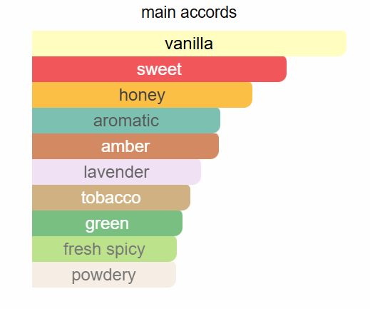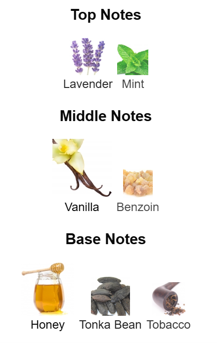 Top notes are Lavender and Mint; middle notes are Vanilla and Benzoin; base notes are Honey, Tonka Bean and Tobacco.