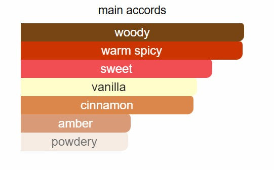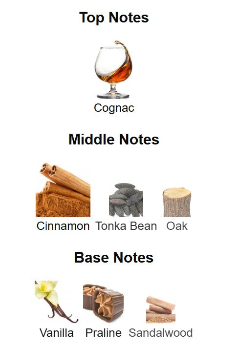 Top note is Cognac; middle notes are Cinnamon, Tonka Bean and Oak; base notes are Vanilla, Praline and Sandalwood.