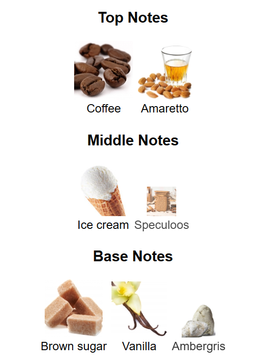 Top notes are Coffee and Amaretto; middle notes are Ice cream and Speculoos; base notes are Brown sugar, Vanilla and Ambergris.