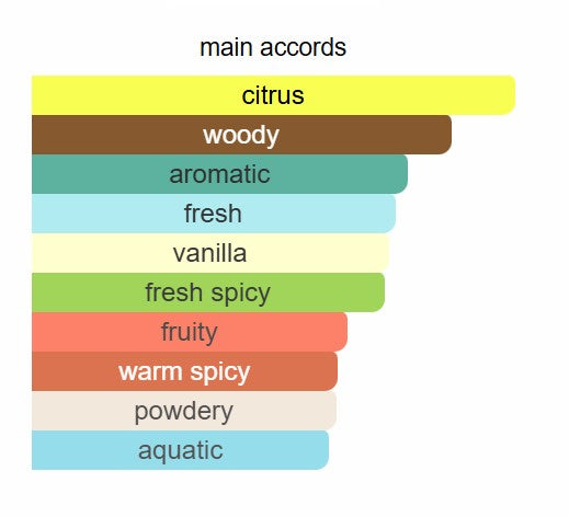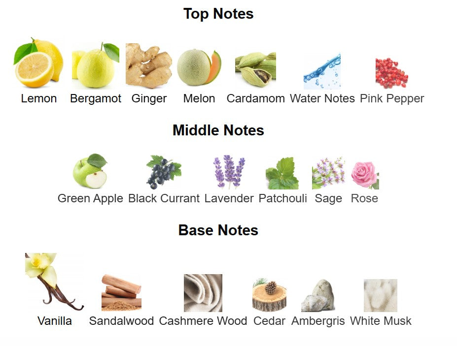 Top notes are Lemon, Bergamot, Ginger, Melon, Cardamom, Water Notes and Pink Pepper; middle notes are Green Apple, Black Currant, Lavender, Patchouli, Sage and Rose; base notes are Vanilla, Sandalwood, Cashmere Wood, Cedar, Ambergris and White Musk.