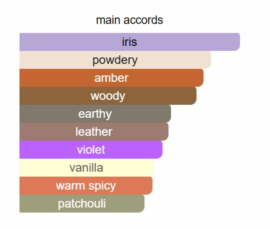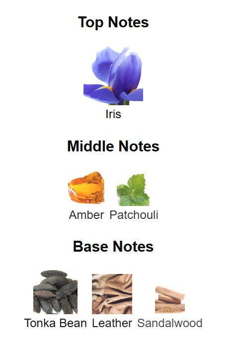 Top note is Iris; middle notes are Amber and Patchouli; base notes are Tonka Bean, Leather and Sandalwood.