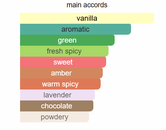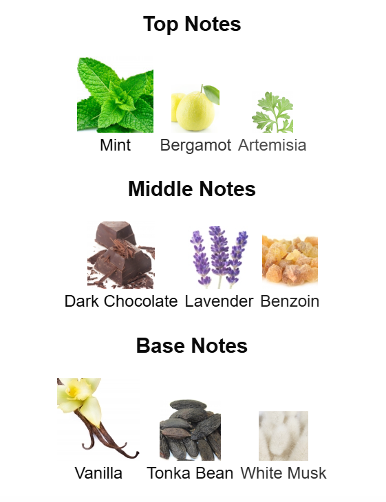 Top notes are Mint, Bergamot and Artemisia; middle notes are Dark Chocolate, Lavender and Benzoin; base notes are Vanilla, Tonka Bean and White Musk.
