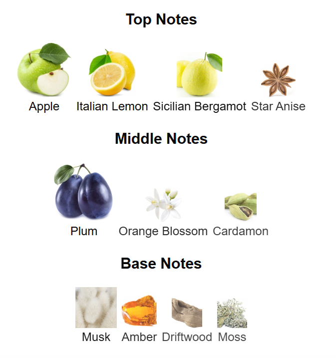 Top notes are Apple, Italian Lemon, Sicilian Bergamot and Star Anise; middle notes are Plum, Orange Blossom and Cardamon; base notes are Musk, Amber, Driftwood and Moss.