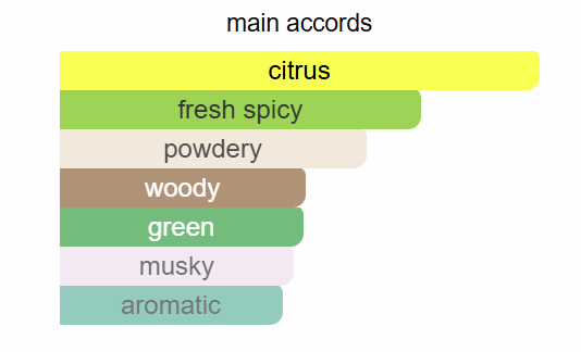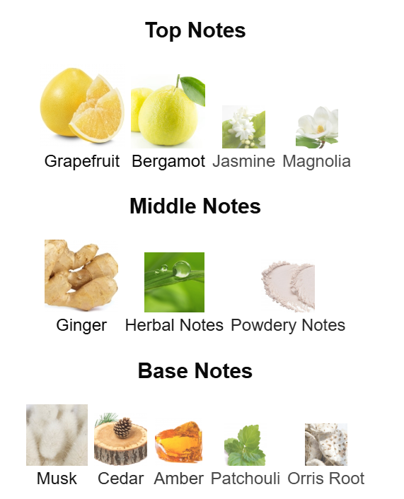 Top notes are Grapefruit, Bergamot, Jasmine and Magnolia; middle notes are Ginger, Herbal Notes and Powdery Notes; base notes are Musk, Cedar, Amber, Orris Root and Patchouli.