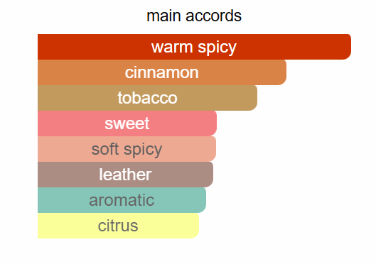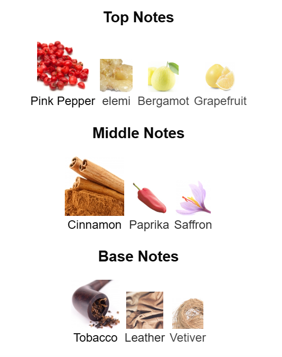Top notes are Pink Pepper, elemi, Bergamot and Grapefruit; middle notes are Cinnamon, Paprika and Saffron; base notes are Tobacco, Leather and Vetiver.