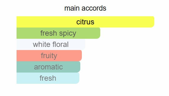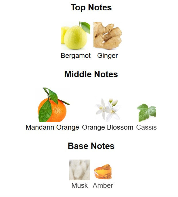 Top notes are Bergamot and Ginger; middle notes are Mandarin Orange, Orange Blossom and Cassis; base notes are Musk and Amber.